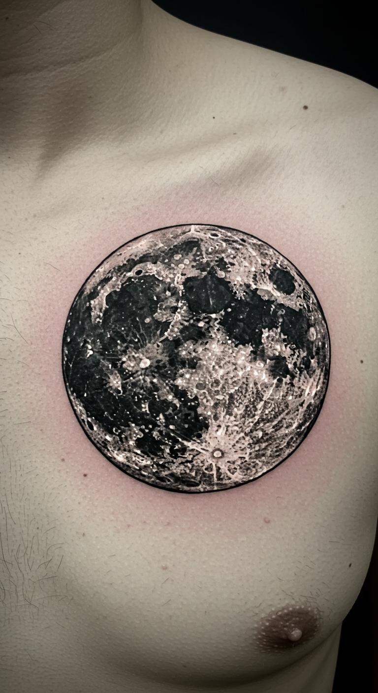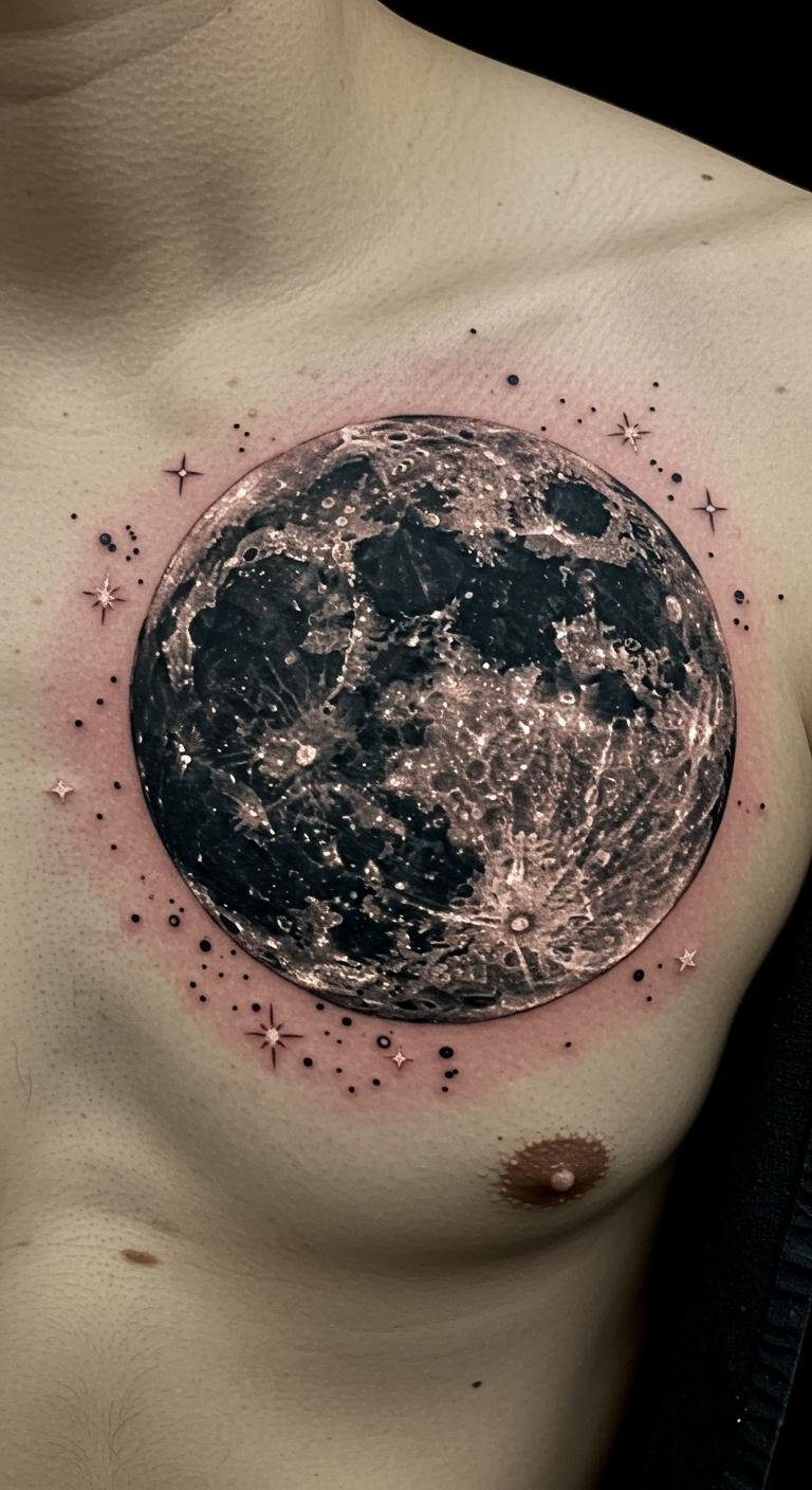 Stick with black ink for a full moon. Timeless and sharp. Chest is central. Get it for $100. Test with black markers—simple. Outline clearly. Black lasts longer. This choice is straightforward. Black ink suits any budget.