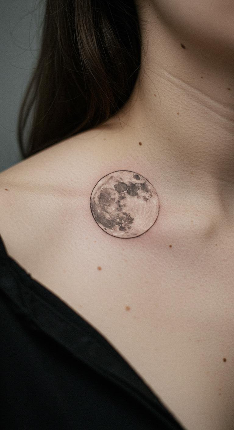 Design a full moon with feminine touches. Curves and flow. Collarbone is graceful. Expect $140. Sketch with soft pencils. Add symbols like waves. This empowers stories. Feminine designs resonate deep.