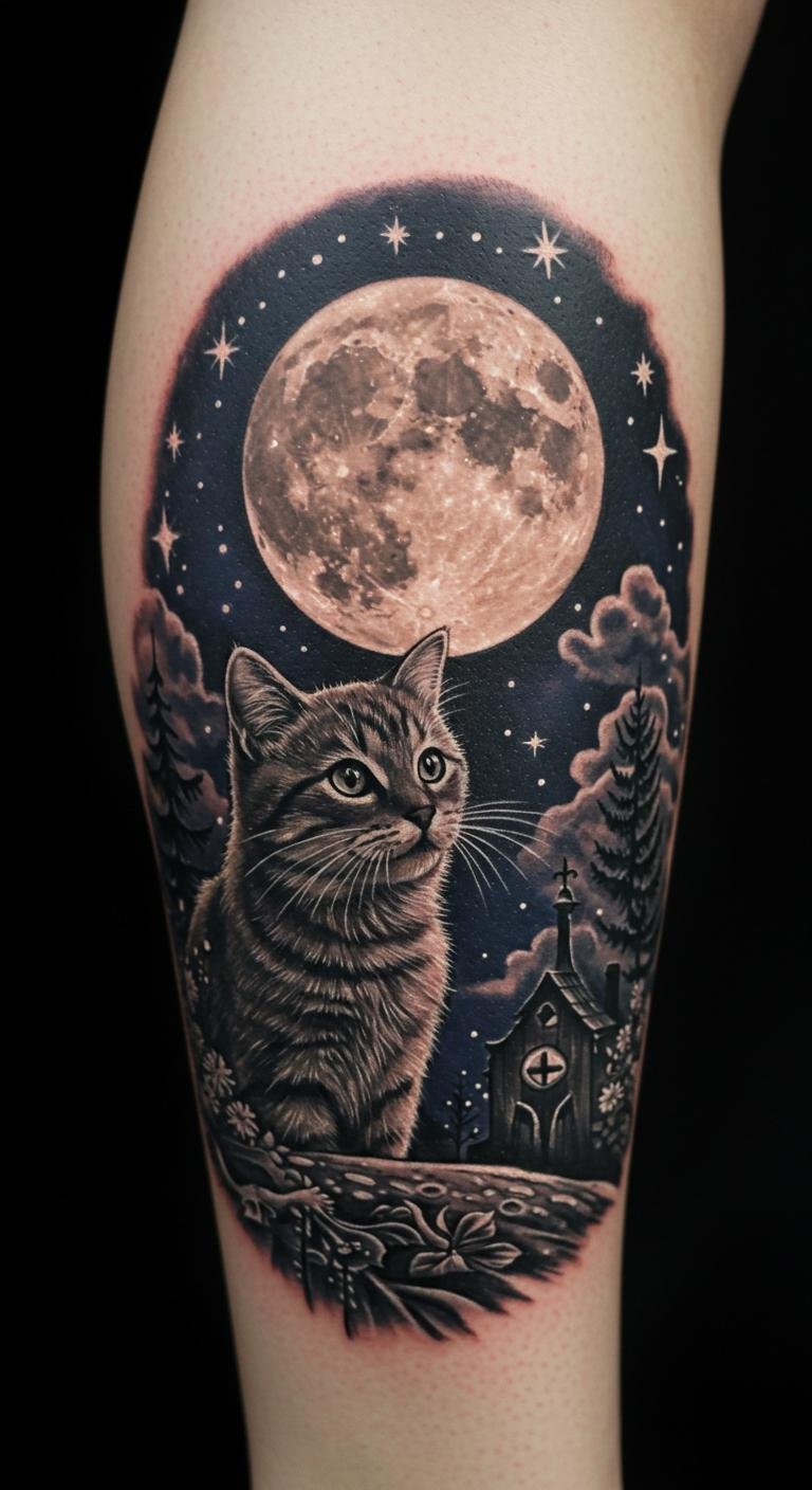 Pair a cat with a full moon for whimsy. Fun and mystical. Calf is playful. Get it for $130. Sketch cat faces. Add eyes for charm. Cat tattoos bring luck. Mystical combos delight.