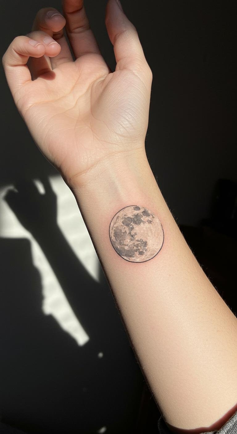 A small full moon on the wrist is subtle. Easy to show off. Wrist heals quick. Get it for $70. Try with temporary ink kits—under $5. Draw a tiny circle. Add details if you like. This spot is practical for daily life. Small means less pain too.