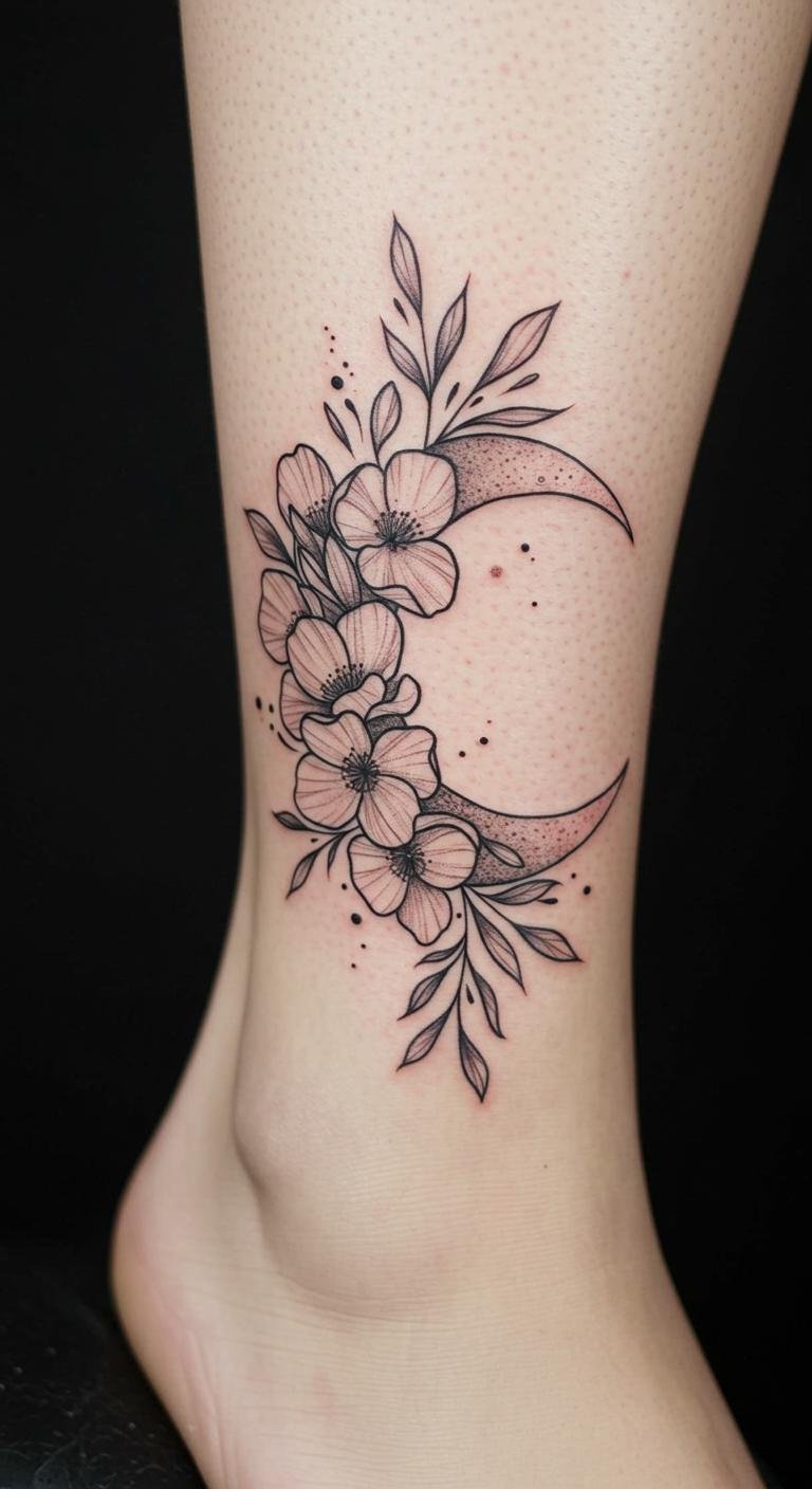 Wrap flowers around a full moon for nature vibes. It’s fresh and feminine. Ankle works nicely. Get it for about $140. DIY with flower stencils from craft stores—under $10. Draw petals around a circle. Use colored pencils for color tests. Flowers hide any mistakes. Choose local blooms for meaning. This design blooms on a budget.