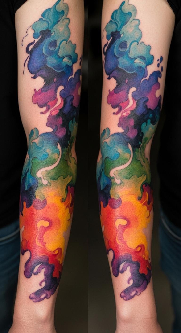 Watercolor abstracts create fluid art. Blends of color flow down your arm. Experiment with paints at home first. It’s low-cost.