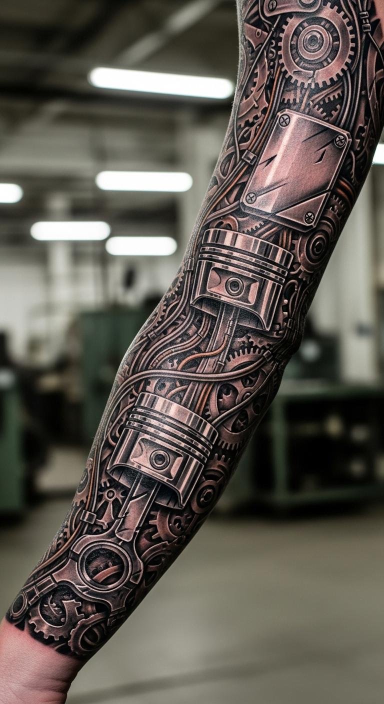 Cyberpunk sleeves mix tech and body. Gears and circuits intrigue. Sketch machines on paper to begin. It’s budget-smart.