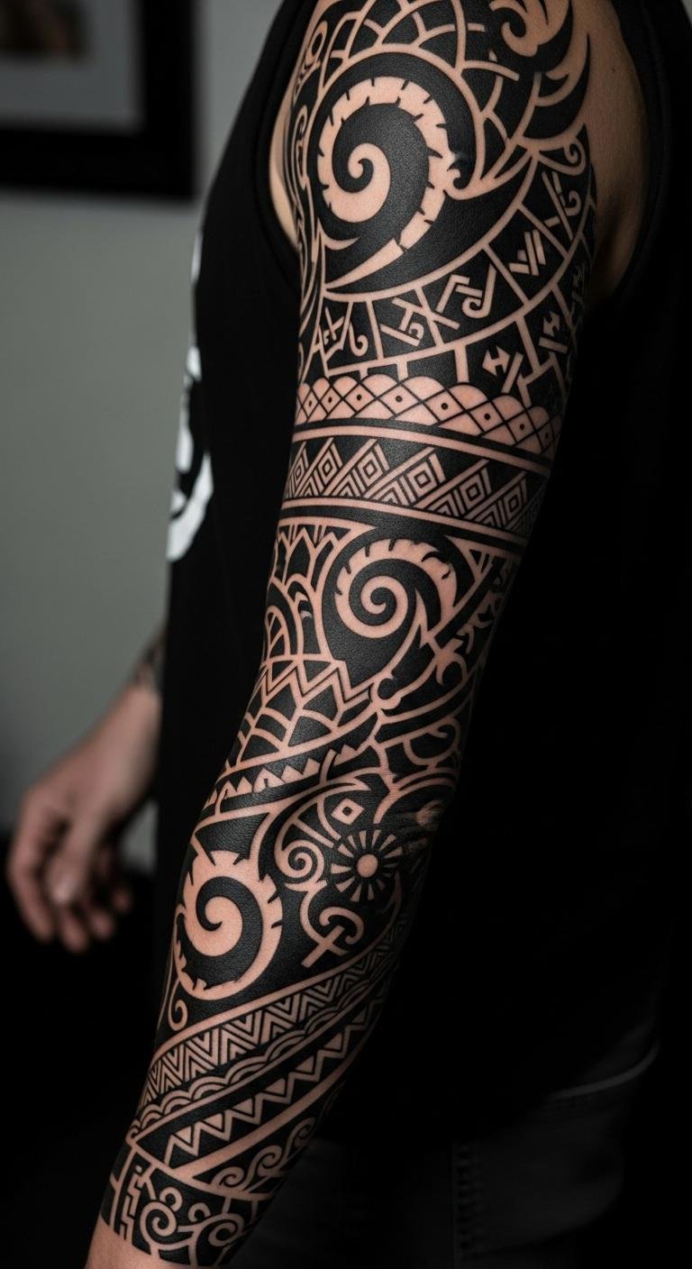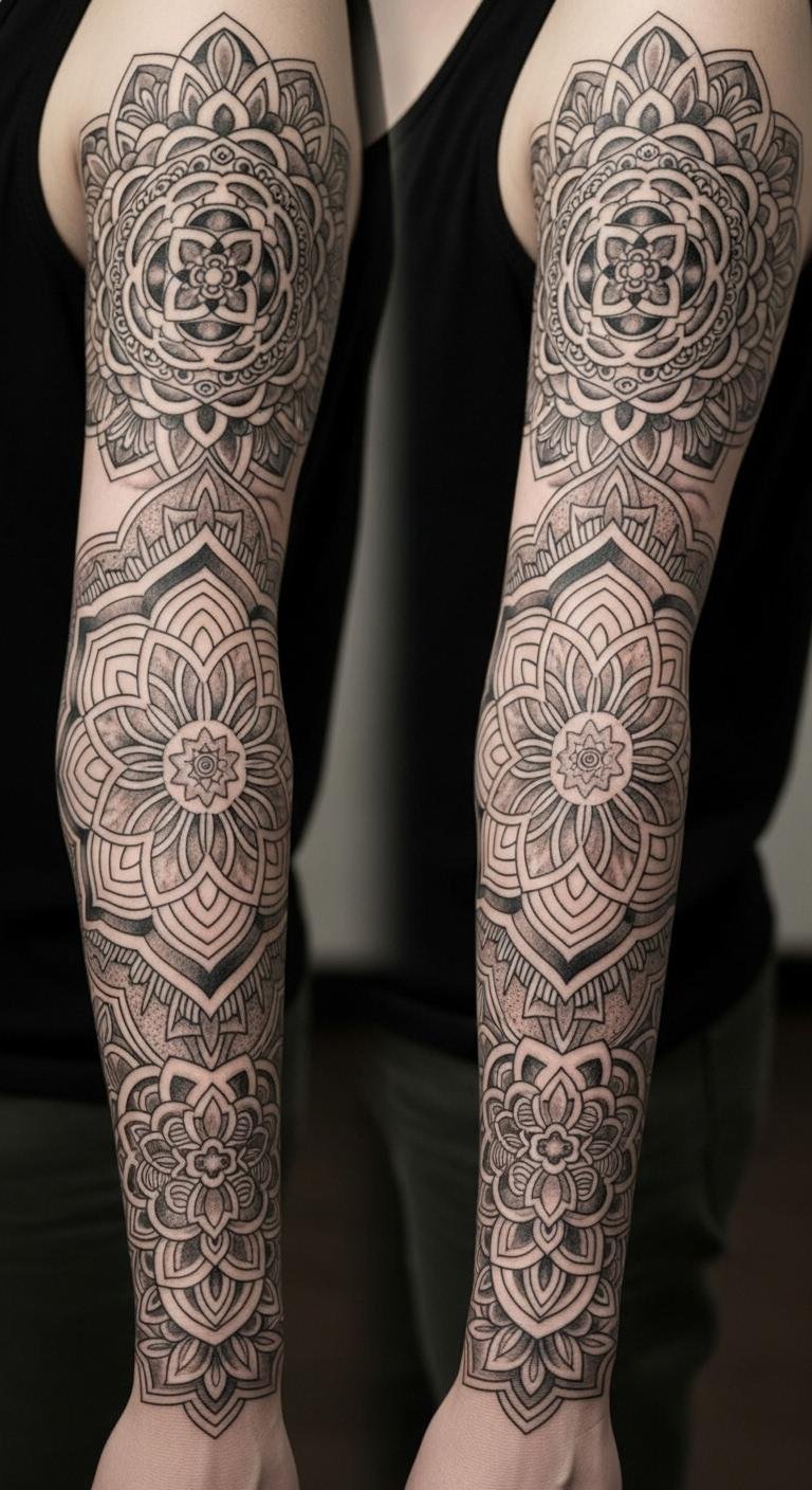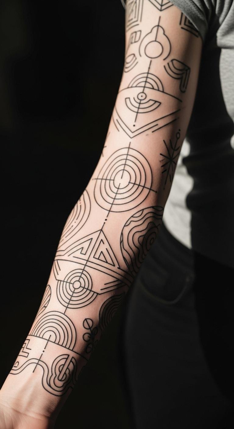 Geometric sleeves play with shapes and lines. They create cool illusions on your skin. Start by drawing grids on paper to map it out. Use a ruler for straight edges. This style fits if you like clean designs. Find free templates online to sketch ideas.