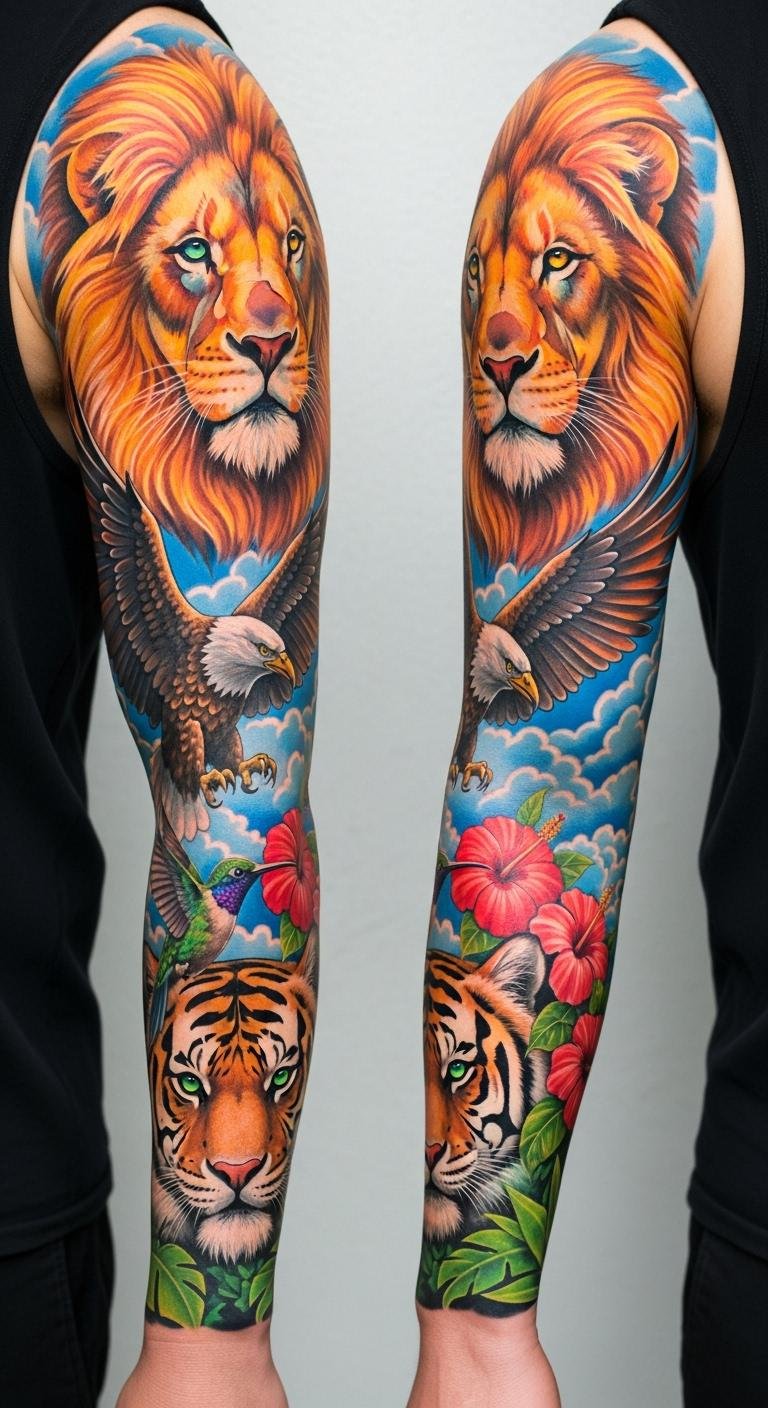 Colorful animals turn your sleeve into a zoo. Think lions, birds, and more. Sketch animals from books to plan. Use colored pencils for fun. This style pops with energy.