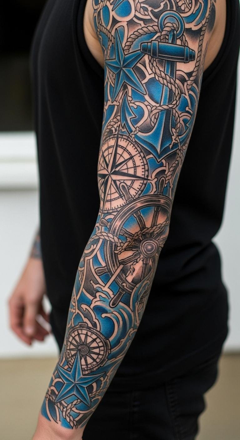 Start at the shoulder with a big anchor. Add stars down to the wrist. For savings, use free nautical drawings online. Artists charge about $90 an hour, so plan ahead.