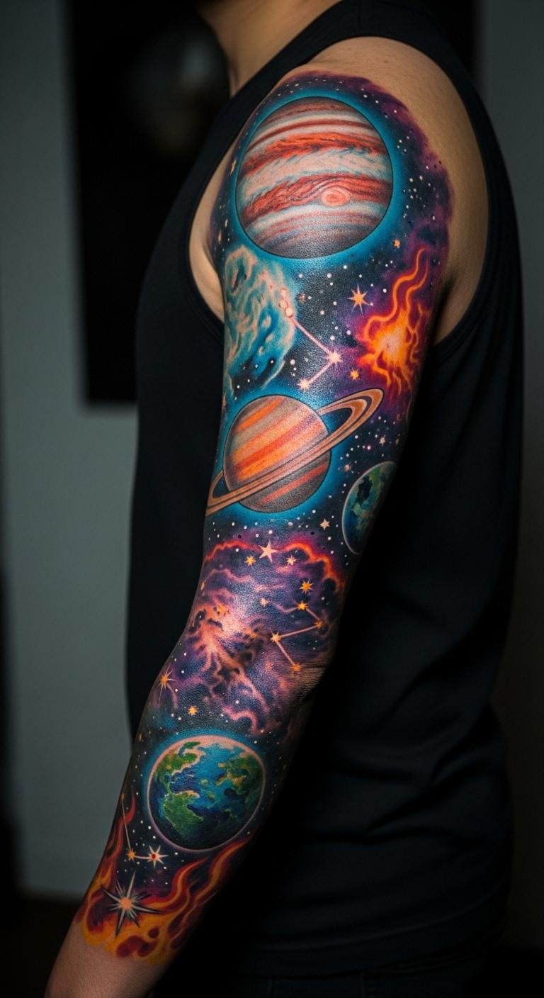 Galaxy sleeves explore the universe on your skin. Planets, stars, and nebulas shine. Draw stars on paper first. It’s a cheap start.