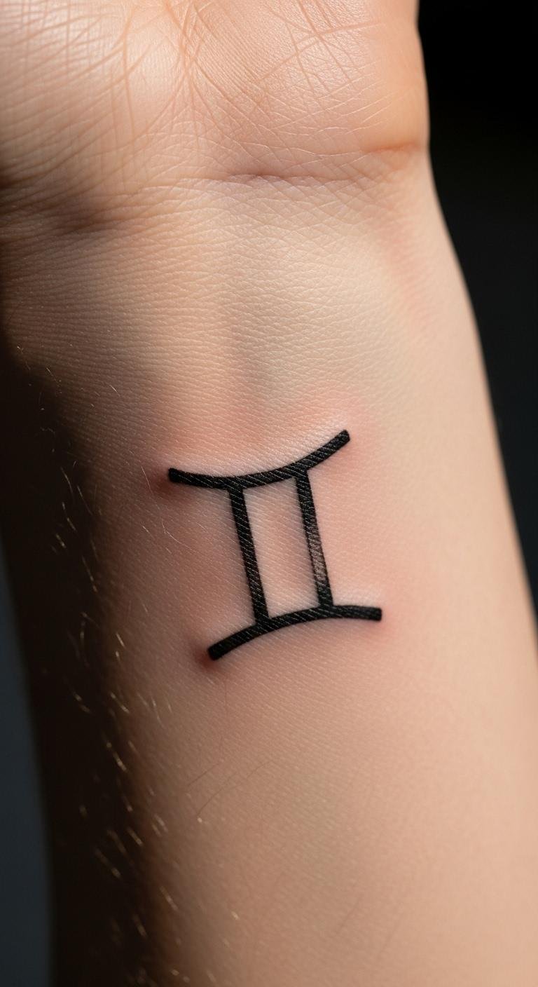 Minimalist black ink keeps Gemini tattoos clean. It’s all about simple lines. This style is timeless. Place it anywhere you like. Budget tip: Go for small designs at budget shops. Under $50. DIY example: Draw straight lines on paper. Make the glyph basic. Use a ruler. Test it with a friend. Then, ink it. Black ink lasts long. This approach saves on color costs. It’s perfect for beginners. Add your twist easily.
