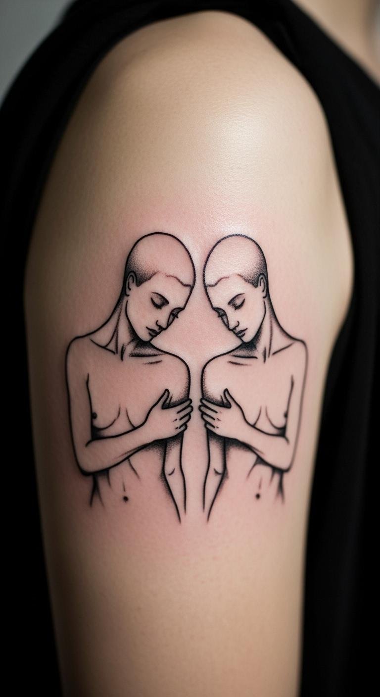 Mirrored twins make a strong Gemini statement. They show two sides in one image. Picture two figures facing each other. This design highlights balance. Place it on your shoulder for impact. Budget tip: Look for flash sales at tattoo studios. They might cost $80 or less. DIY example: Draw two simple figures on paper. Use a mirror to get the symmetry. Then, show your sketch to an artist. Keep lines bold but basic. This helps cut costs. The tattoo works for any skin tone. Add colors if you’re feeling bold. But stick to black for starters. It’s versatile for daily wear. Think about how it reflects your life. Mirrored designs add a personal touch.