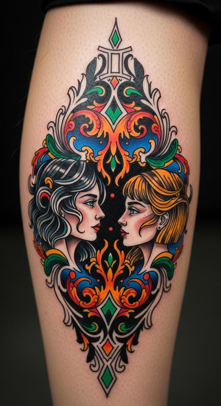 Neo-traditional adds colors to Gemini themes. It’s vivid and fun. Use twins with shades. Put it on your leg. Budget tip: Find artists who offer color upgrades for extra. Around $90. DIY example: Color in a twin design on paper. Use markers for vibrancy. Practice blending. Bring it to the session. This style pops. It’s great for lively expressions. Keep colors bold but few.