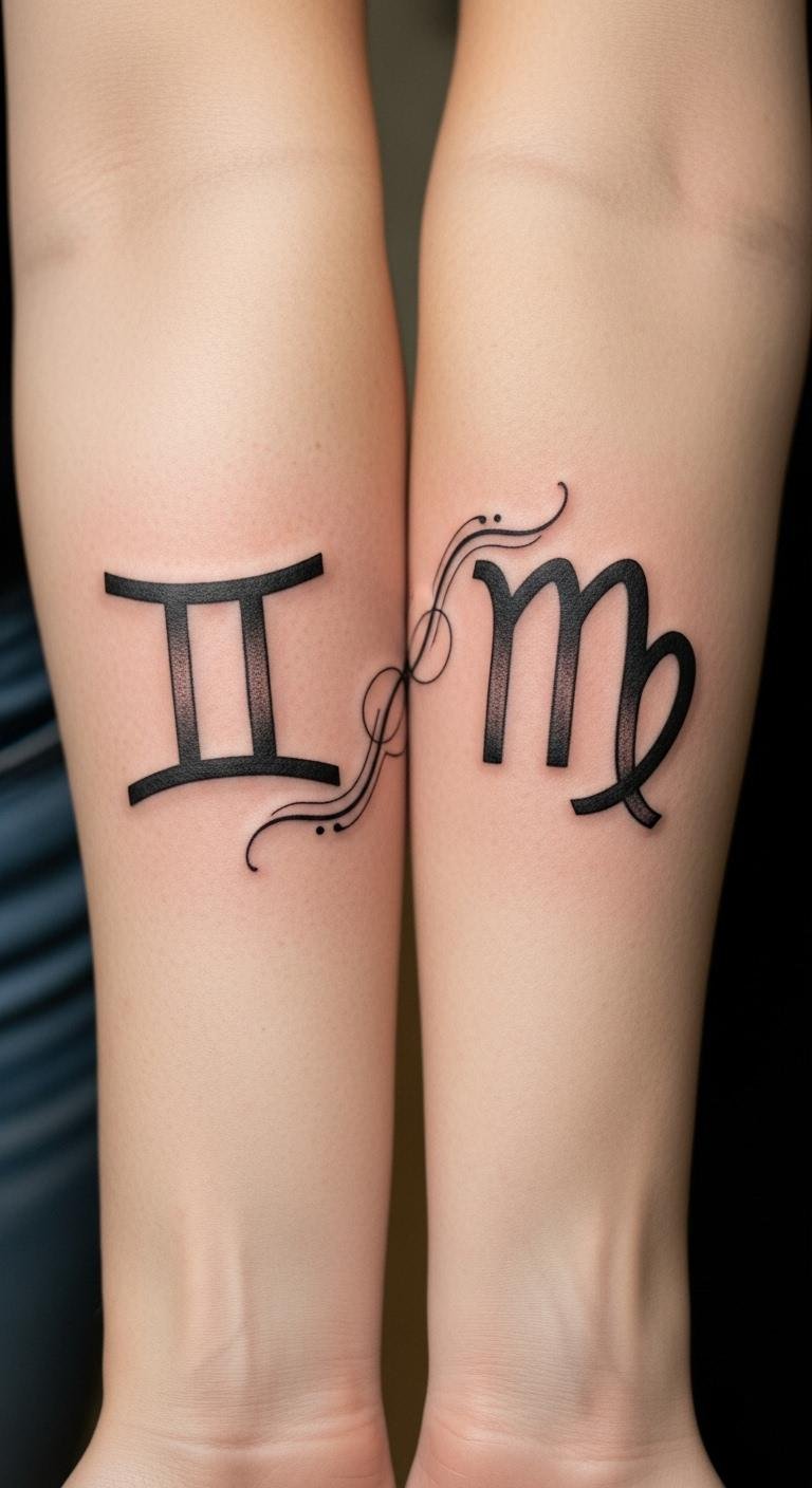 Pair Gemini with Virgo for bonds. It’s about connections. This tattoo shows compatibility. Put it on your arm. Budget tip: Get both in one session for savings. $80 total. DIY example: Sketch the two symbols together. Link them simply. Draw on paper. Discuss with an artist. This design celebrates relationships. It’s meaningful and fun.