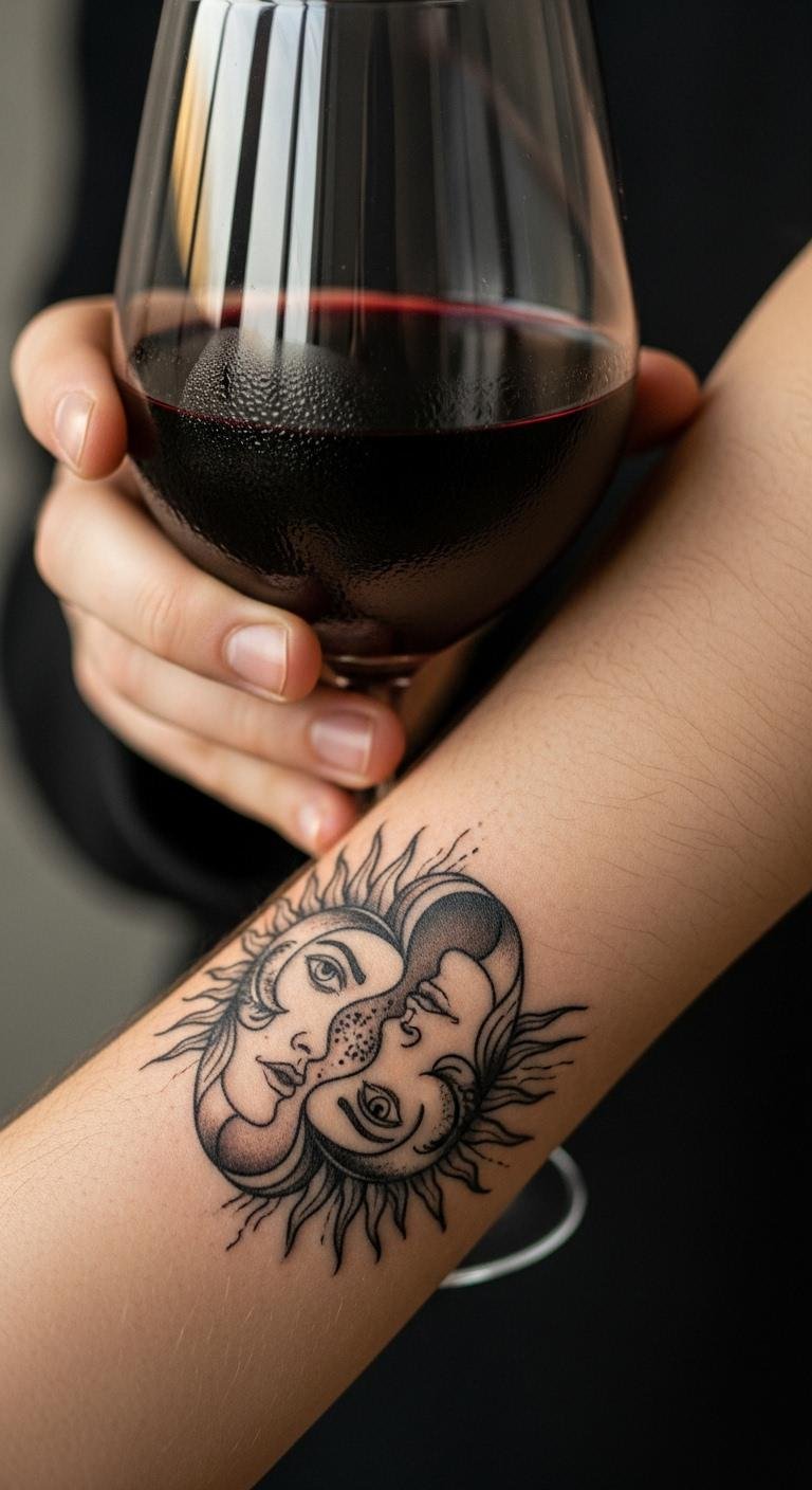 A wine glass with duality adds a mature twist. It shows balance in life. This design is unique. Put it on your forearm. Budget tip: Combine with simple elements. $80. DIY example: Sketch a glass with twin motifs. Add basic shades. Draw first. Then, ink it. This tattoo personalizes fun. It’s for adults.