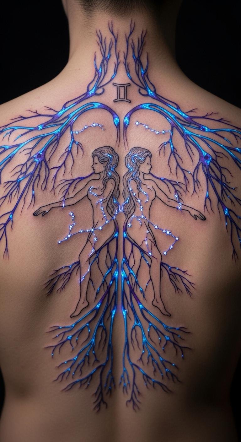 Upper back tattoos show Gemini’s dual images. They offer space for creativity. Try two faces or symbols. Budget tip: Look for multi-session packages. Costs about $100. DIY example: Sketch two simple images side by side. Shade them lightly. Practice on a large paper. Share with your artist. Use black ink for definition. This design tells a deep story. It’s ideal for personal reflection. Make it fit your back’s curve.