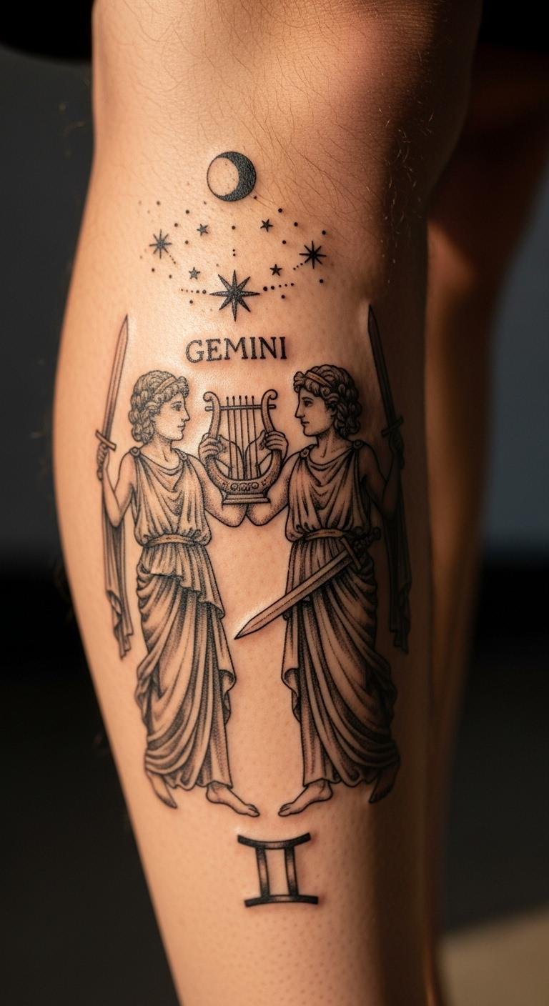 Mythology elements bring history to Gemini tattoos. They’re rich in story. This design educates. Place it on your leg. Budget tip: Use basic symbols. $70. DIY example: Sketch ancient twins. Add details simply. Draw on paper. Get professional help. This tattoo connects past and present. It’s engaging and affordable.