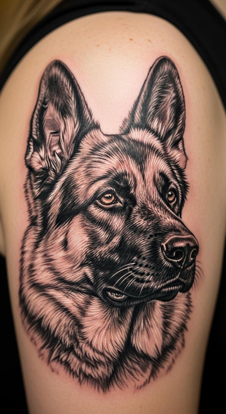 A realistic portrait brings your German Shepherd to life on your skin. Think of it as a forever photo of your pet’s face. Start with a clear picture of your dog for the artist. This style uses simple shading to highlight those expressive eyes and fur. For a budget option, sketch the design at home using free apps like Canva. Add personal touches, like your dog’s ear shape, to make it unique. Keep costs down by choosing a local artist over big studios. Break it into steps: first, gather reference images; next, discuss with your tattooist. This approach lets you create something meaningful without extra fees. Bold details, like the eyes, make it pop. Try practicing with temporary stickers first to see how it looks. Easy tweaks ensure the final result fits your vision.
