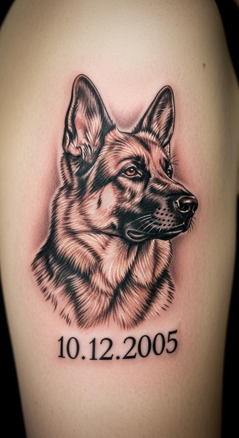 Memorial tattoos remember your German Shepherd with dates. They turn loss into lasting art. Note important dates and incorporate them simply. Use free design apps to combine elements. For example, add numbers to a portrait. This home prep cuts costs. Choose arm spots for meaning. Bold the date for prominence. Practice with date stickers. These actions honor your pet affordably.