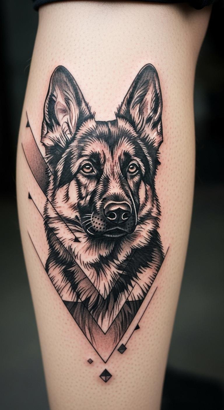 Geometric fusions add shapes to German Shepherd designs for a unique look. They’re trendy and versatile. Mix free geometric patterns with dog motifs at home. For instance, add triangles to an outline. This DIY method is cost-effective. Fit to your calf for style. Bold the shapes for contrast. Use templates for previews. Simple combinations create wow factor.