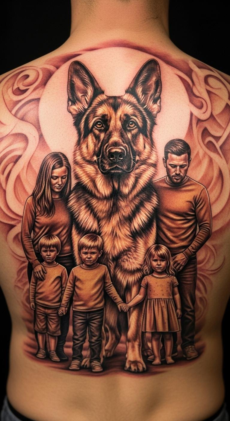 Family themes link German Shepherds to loved ones in tattoos. They symbolize shared bonds. Sketch family icons with your dog at home. Use free drawing tools for this. For instance, add figures around the pet. It saves on professional fees. Position on your back for space. Bold the dog for focus. Practice with family photos. These steps build a personal story.