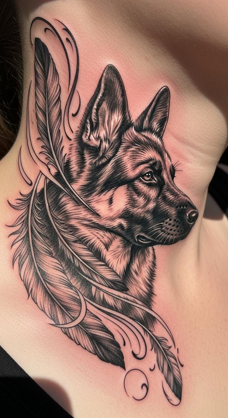 Feathers bring a light feel to German Shepherd tattoos. They symbolize freedom and grace. Sketch feathers around your dog design at home. Use online freebies for this. For example, add them to the edges. It keeps costs low. Place on your neck for elegance. Bold the feathers for flow. Practice with feather drawings. These additions enhance beauty.