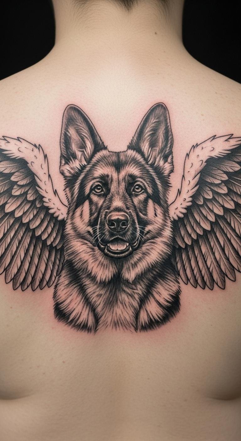 Angel wings turn German Shepherd tattoos into memorials. They offer a protective aura. Draw wings and integrate your dog using free tools. For instance, place them behind the pet. This method is budget-wise. Position on your back for scale. Bold the wings for drama. Use stencils for tests. Meaningful choices make it profound.