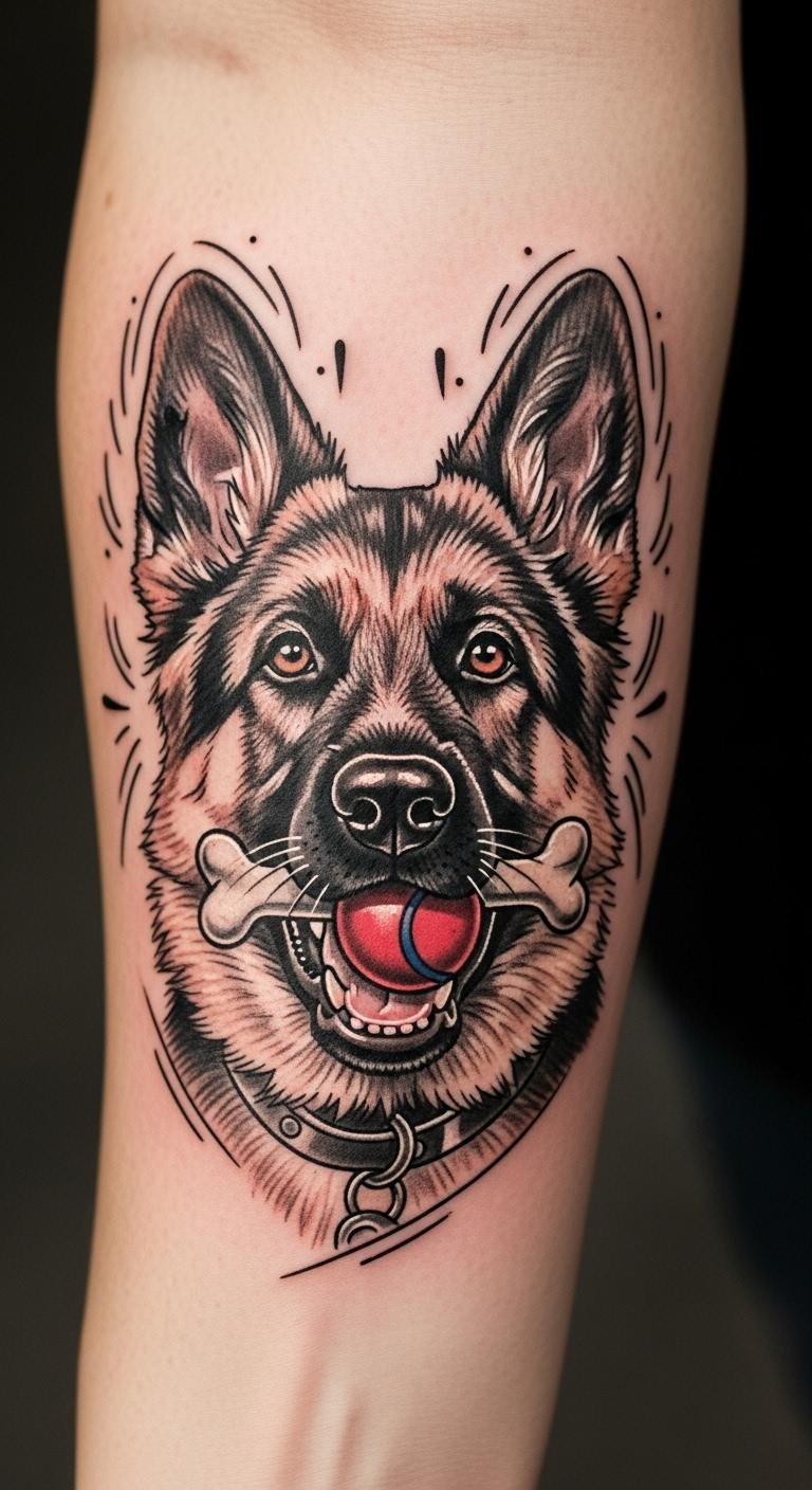 Make your tattoo unique by adding your German Shepherd’s favorite toy, like a ball or stick. This turns it into a story of your pet’s personality. Start by noting what your dog loves most. Use free design apps to combine elements before your appointment. For instance, draw a quick sketch of the dog holding a toy on plain paper. It keeps costs low and creative. Choose spots like your arm for visibility. Bold the toy part to stand out. Practice with affordable temporary tattoos that include extras. This DIY twist ensures the design feels special and true to your bond.