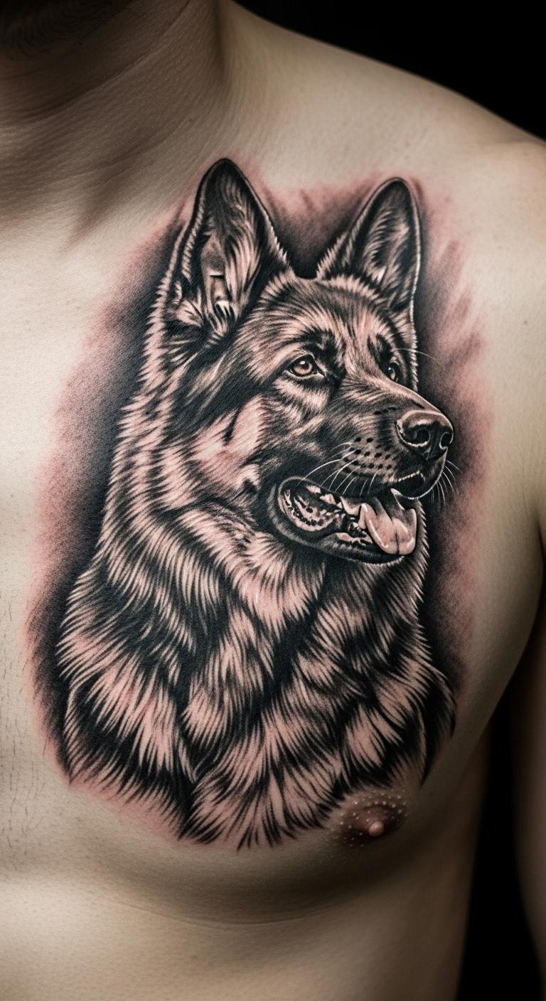 Black and grey shading gives German Shepherd tattoos a timeless feel. It focuses on depth and texture for a lifelike effect. Begin with photos of your dog to guide the artist. Save by using online freehand tools to outline ideas. For example, print a simple shaded drawing and adjust it yourself. This makes the process straightforward. Pick areas like your chest for a bold statement. Highlight fur details to add character. Try mock-ups with cheap shading pencils at home. These tips help you achieve great results on a budget.