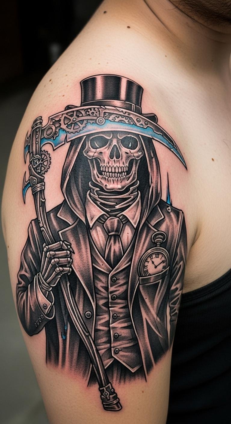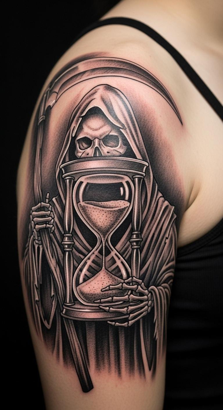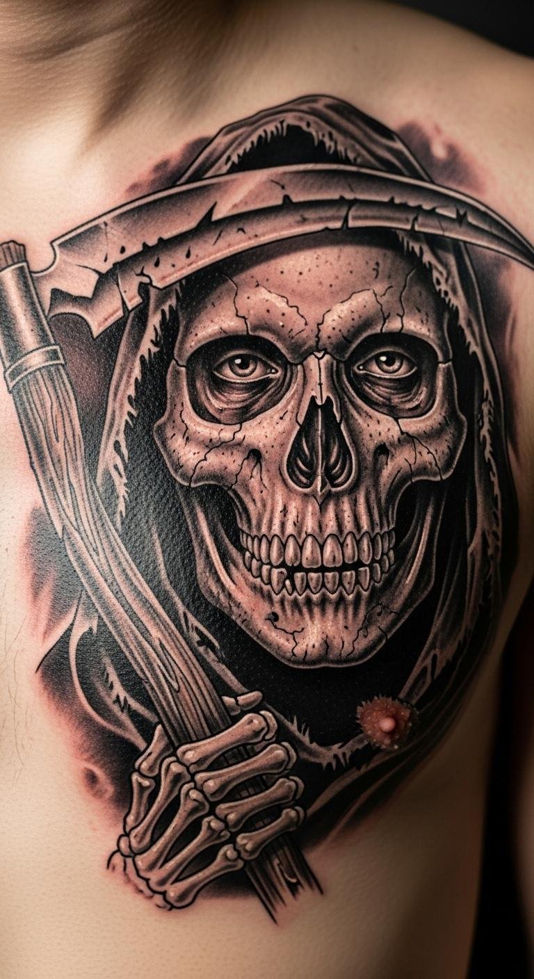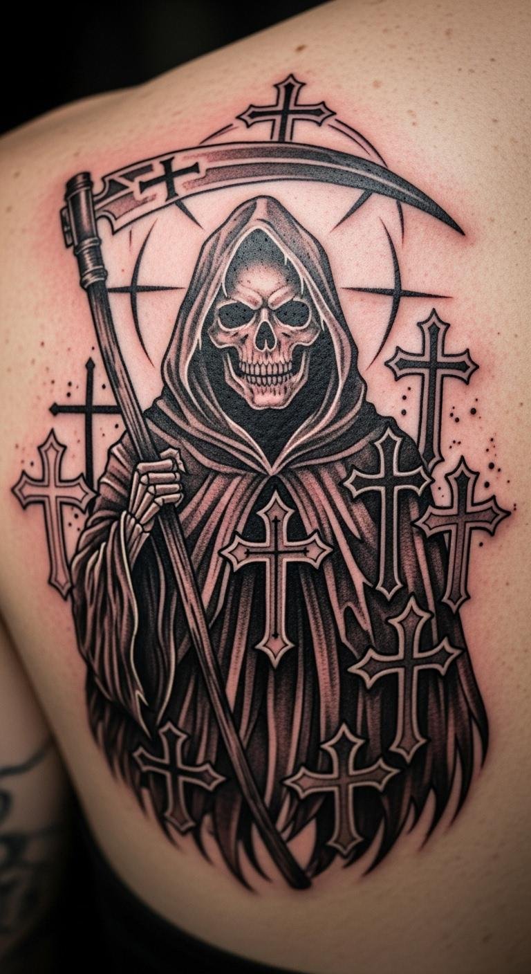 A spiritual Grim Reaper with crosses on the shoulder blade offers peace. Combine symbols thoughtfully. Draw them together at home. Find spiritual-focused artists for $250. Add crosses that mean something. Test with drawn outlines. This design is deeply personal and cost-effective.
