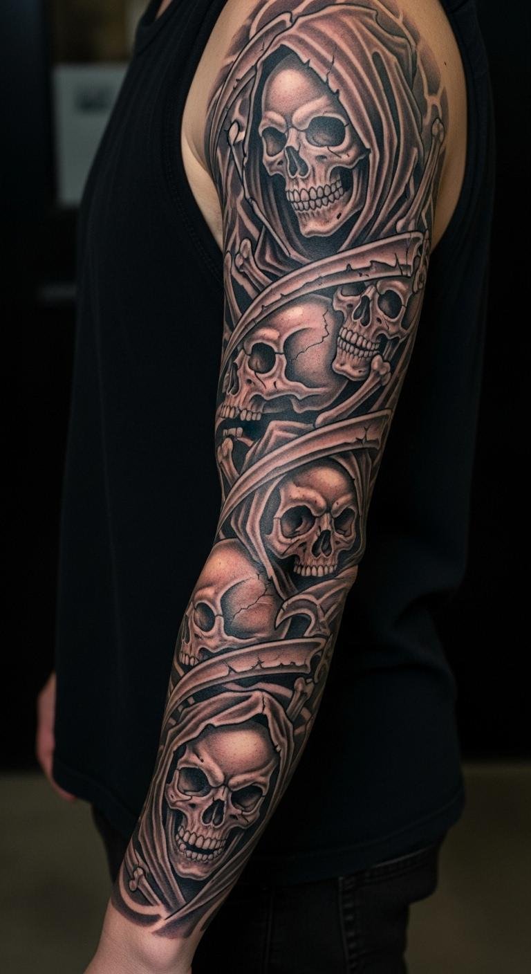 A half sleeve Grim Reaper with skulls builds a narrative flow. Divide it into sections for comfort. Sketch the layout on large sheets. Studios offer this for around $350. Incorporate skull counts for significance. Try arm bands with tape first. Use basic inks to keep costs down. It tells a story over time. Start with core elements at home.
