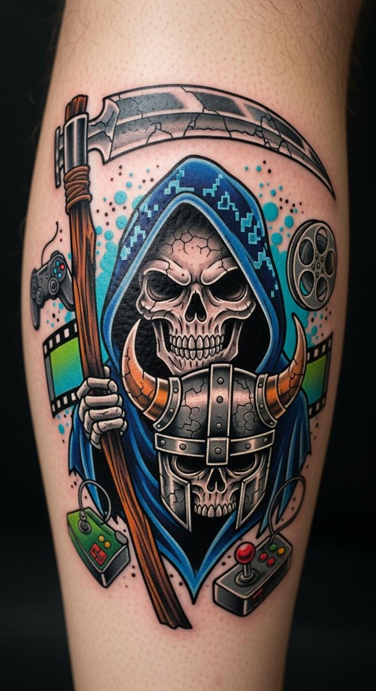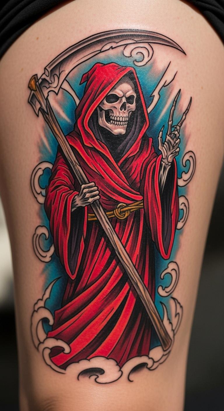 Colorful Grim Reaper on the Thigh