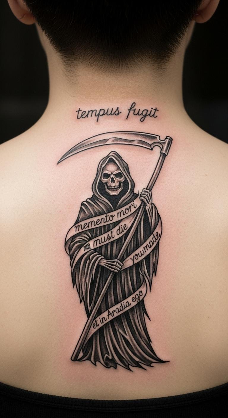 Incorporate quotes with a Grim Reaper on the neck for daily inspiration. Pick short phrases that resonate. Write them on practice paper. Artists charge about $150 for text additions. Choose quotes from your notes. Outline with erasable pens first. Keep text simple to avoid extras. This makes the tattoo interactive.