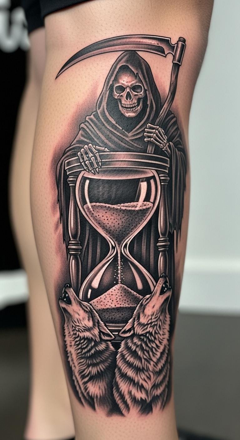 Combine hourglass and wolves with a Grim Reaper on the calf for depth. Layer the design carefully. Sketch the combo on paper. Artists offer for $250. Include your twists. Use free tools to merge ideas. This builds a rich story.