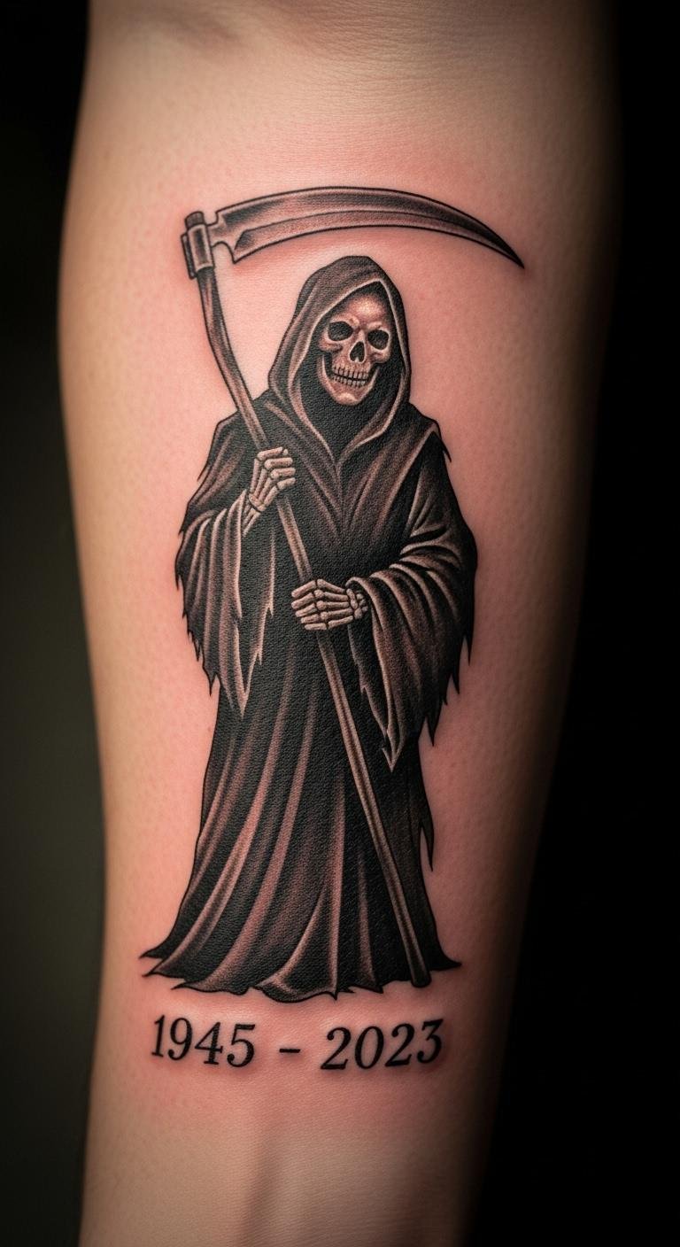 Honor memories with a Grim Reaper and dates on the forearm. Place dates meaningfully. Write them on templates. Artists do this for $150. Choose fonts carefully. Test with written notes. This keeps costs low.