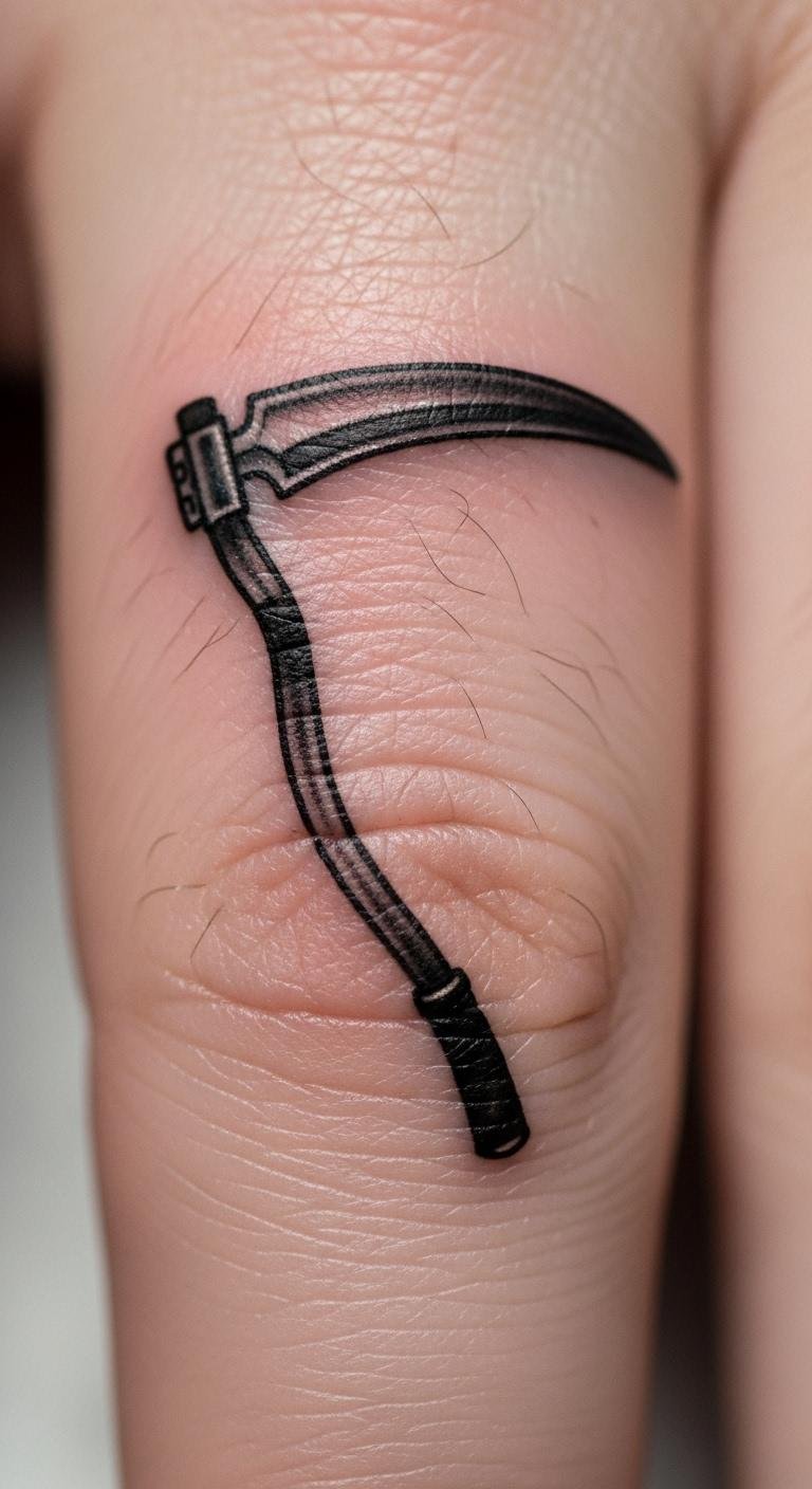 Focus on a scythe with a simple Grim Reaper on the finger. Keep it basic. Sketch the shape quickly. Artists offer for $80. Add a twist if wanted. Use markers for trials. This is quick and cheap.