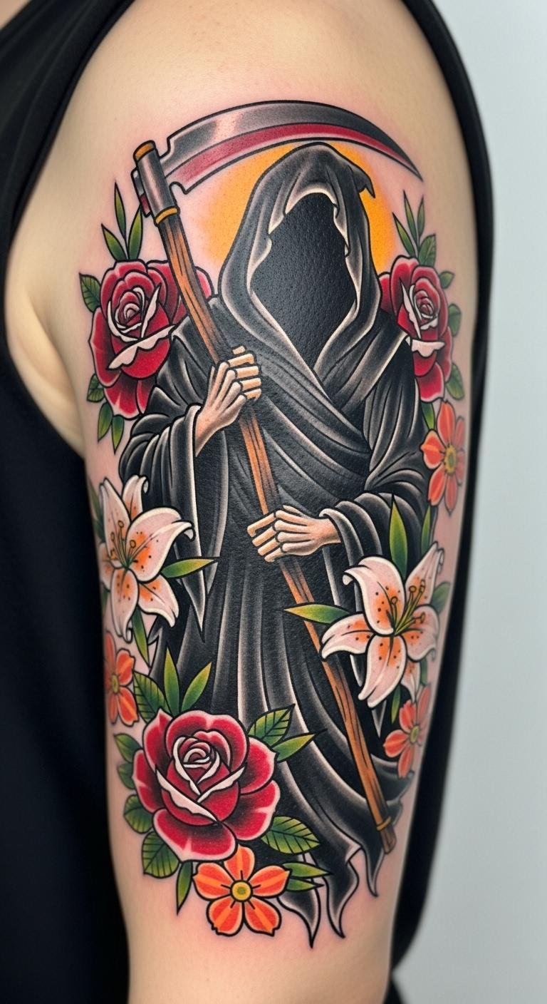 Neo-Traditional Grim Reaper with Flowers