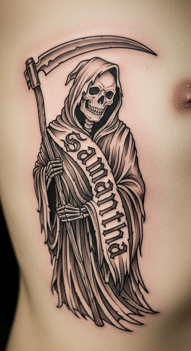 Make it yours with a Grim Reaper featuring your name on the ribcage. Turn it into a family tribute. Write the name on a template at home. Look for personalized services starting at $200. Choose fonts that match your style. Practice with printable stencils. This adds a story without extra cost. Keep the design simple for quick sessions.