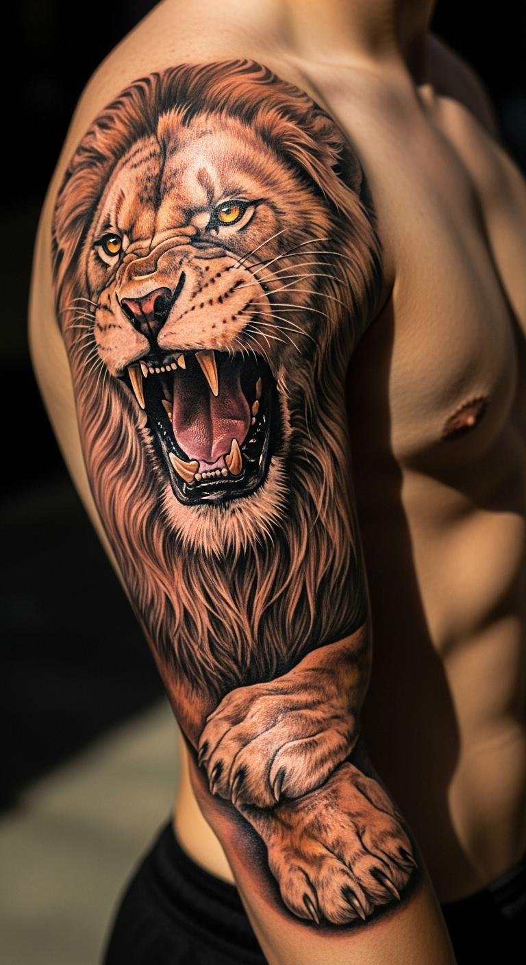 A lion motif roars with strength on your half sleeve. Picture a king of the jungle staring back. Draw it out first with a pencil at home. Find free online images to adapt. Choose a nearby tattoo shop for budget deals. Stick to black and grey for fewer colors and less cost. This design packs impact with minimal elements. Add your twist, like incorporating a date below. Sessions are quick—two hours tops. Practice sketching on your arm with washable ink. It’s an easy DIY step to test ideas. Focus on the elbow area for balance. You’ll feel empowered every day. Keep it simple and bold.