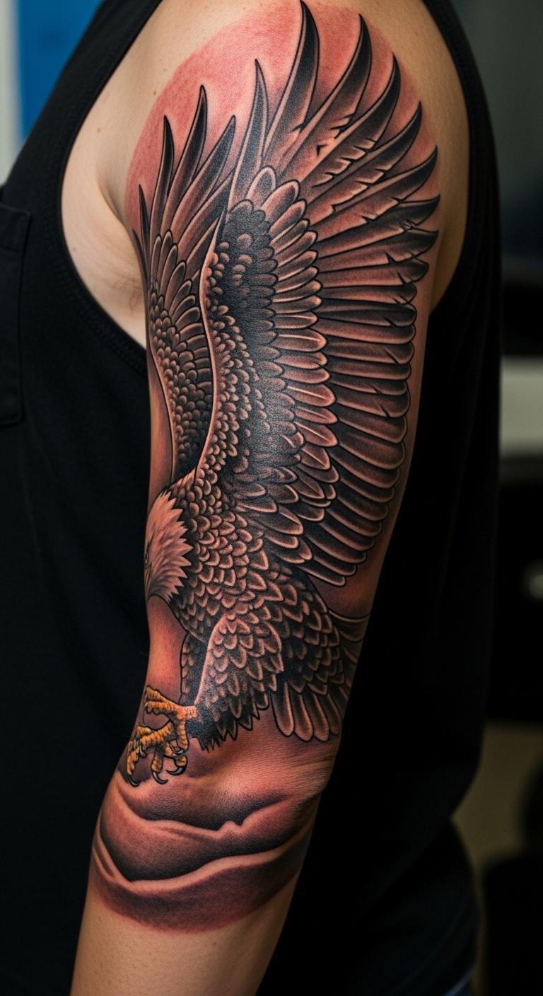 An eagle in flight design soars with freedom. Envision wide wings spread out. Sketch birds at home. Grab free eagle art online. Go to a local spot for pricing. Keep it black and grey. This motif inspires adventure. Personalize with feathers. Plan two sessions. Use paper cutouts for DIY. Place it upper arm. It’s empowering and simple.