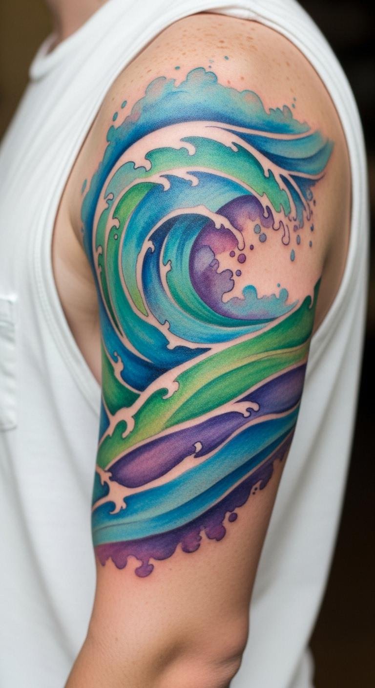 Watercolor waves flow with ease. Picture soft blue waves blending. Paint ideas at home. Find wave tutorials online. Choose a studio for bargains. Use few colors. This design feels artistic. Personalize with foam. Expect three sessions. Try watercolors on paper. Position it upper arm. It’s creative and budget-friendly.