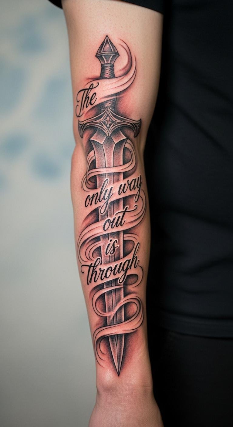 A quote with sword cuts deep. Think a short phrase next to a blade. Write quotes down. Use free fonts online. Visit an affordable place. Go for clean lines. This design inspires. Add your words. Schedule two hours. Practice handwriting. Place it lower arm. It’s motivational and simple.