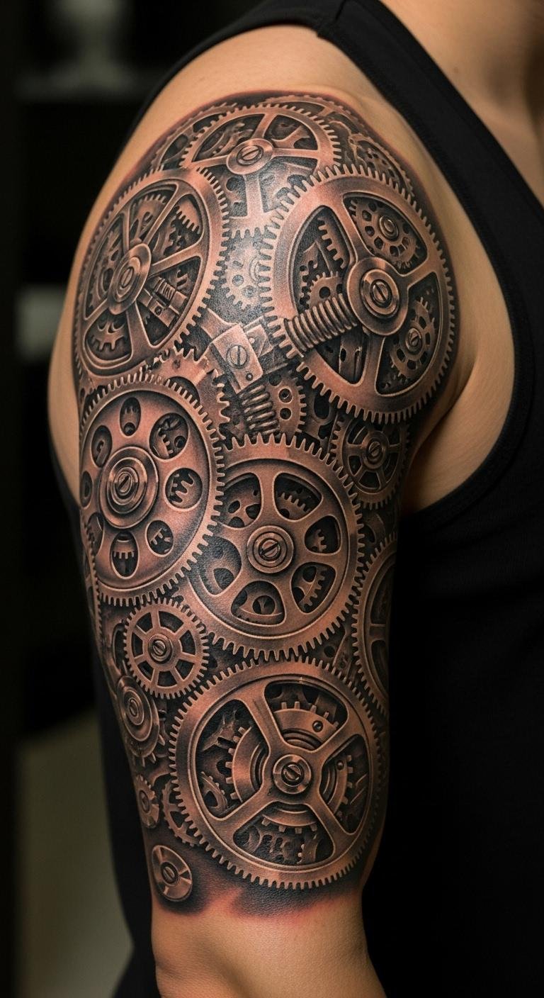 Mechanical gear design gears up innovation. Think interlocking cogs and wheels. Draw machines at home. Find gear templates online. Choose a deal spot. Go black and white. This motif shows drive. Personalize with a bolt. Expect three hours. Use toys for ideas. Position it mid-arm. It’s functional and bold.