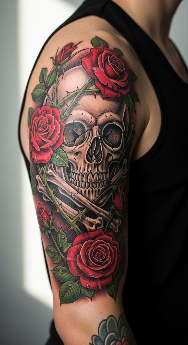 Skull and roses mix danger with beauty on your arm. Imagine a tough skull surrounded by soft blooms. Sketch ideas on paper using basic supplies. Search free apps for rose templates to modify. Visit a local artist during off-peak times for deals. Opt for simple outlines to cut costs. This combo tells a story of life and death. Throw in a small personal element, like an initial. Plan for three sessions, spaced out. Try temporary tattoos first to preview. It’s a cheap way to decide. Place it mid-arm for easy coverage. You’ll command attention with this look. Make it your own easily.