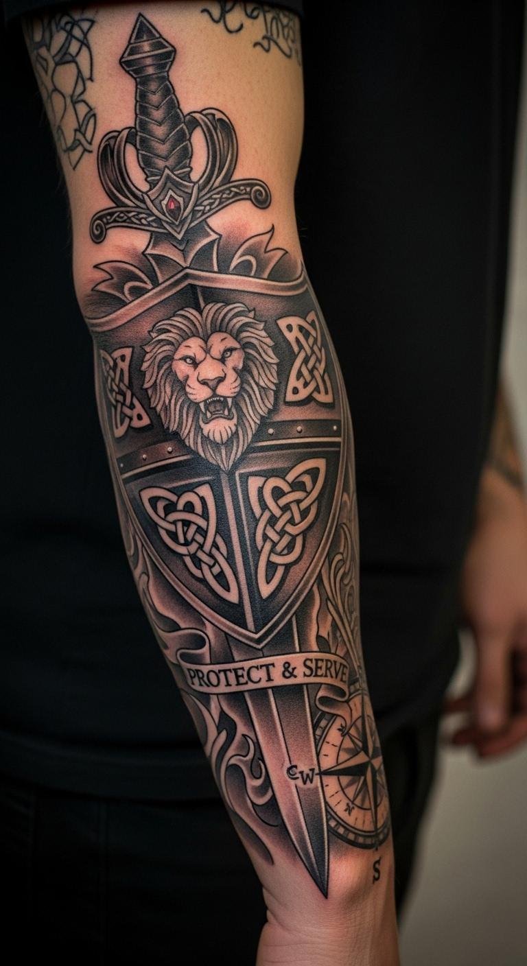 A shield and sword protect fiercely. Envision a strong shield with a blade. Sketch weapons easily. Search medieval art online. Visit a budget place. Keep it simple. This design defends. Add a crest. Schedule two sessions. Practice with cutouts. Place it lower arm. It’s warrior-like and cheap.