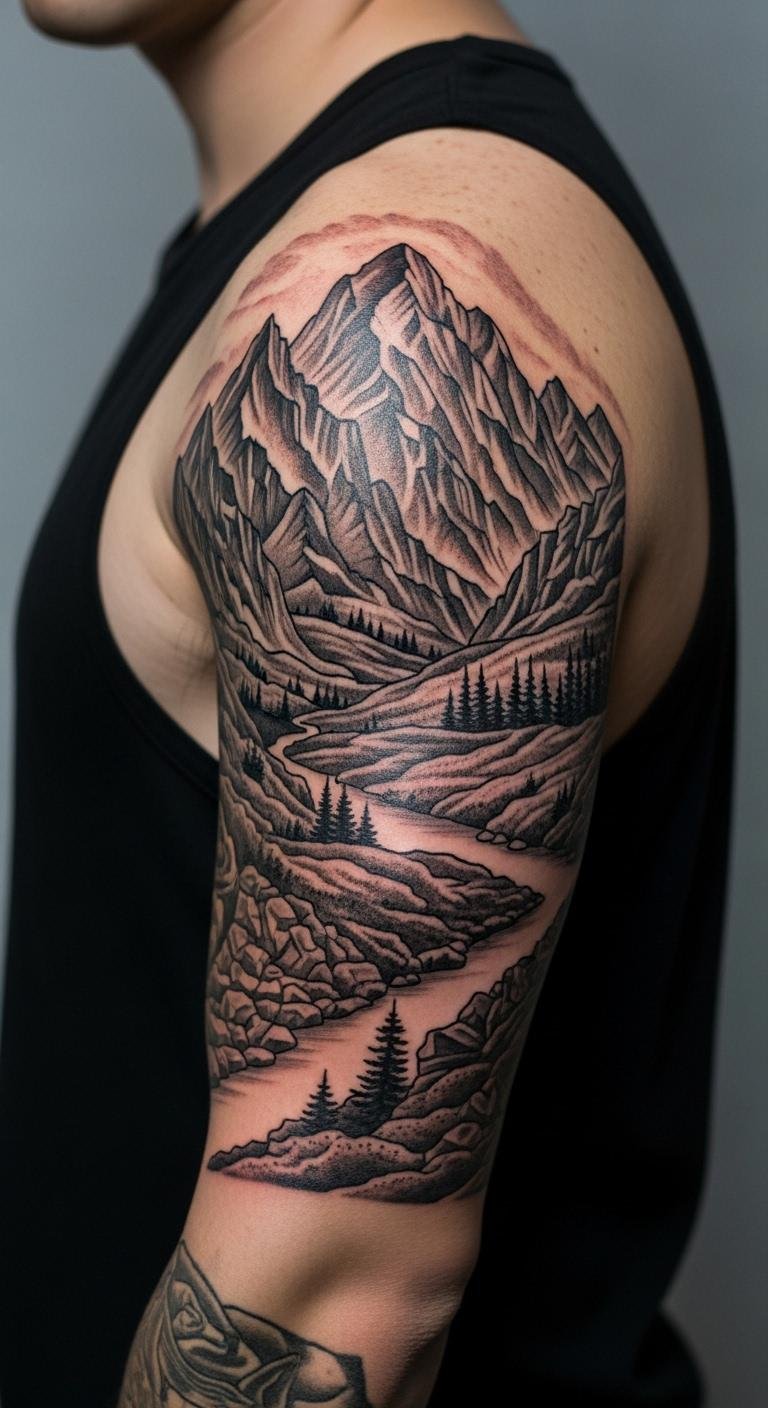 A mountain landscape peaks with adventure. Envision rugged peaks and paths. Draw scenes at home. Find landscape templates online. Choose a deal artist. Go for simple shades. This design inspires climbs. Personalize with a trail. Expect three hours. Try hiking sketches. Position it upper arm. It’s scenic and economical.