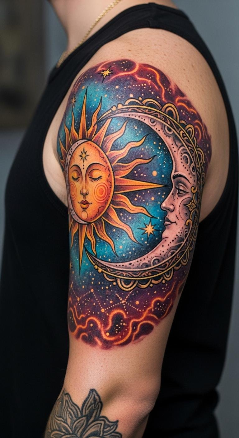 Sun and moon balance represents harmony. Picture sun rays meeting a crescent moon. Draw it out simply. Find celestial images online for free. Pick a studio with deals. Use one color for economy. This design symbolizes duality. Add stars for flair. Aim for three sessions. Test with doodles at home. Fit it from shoulder down. It’s an elegant, budget choice.