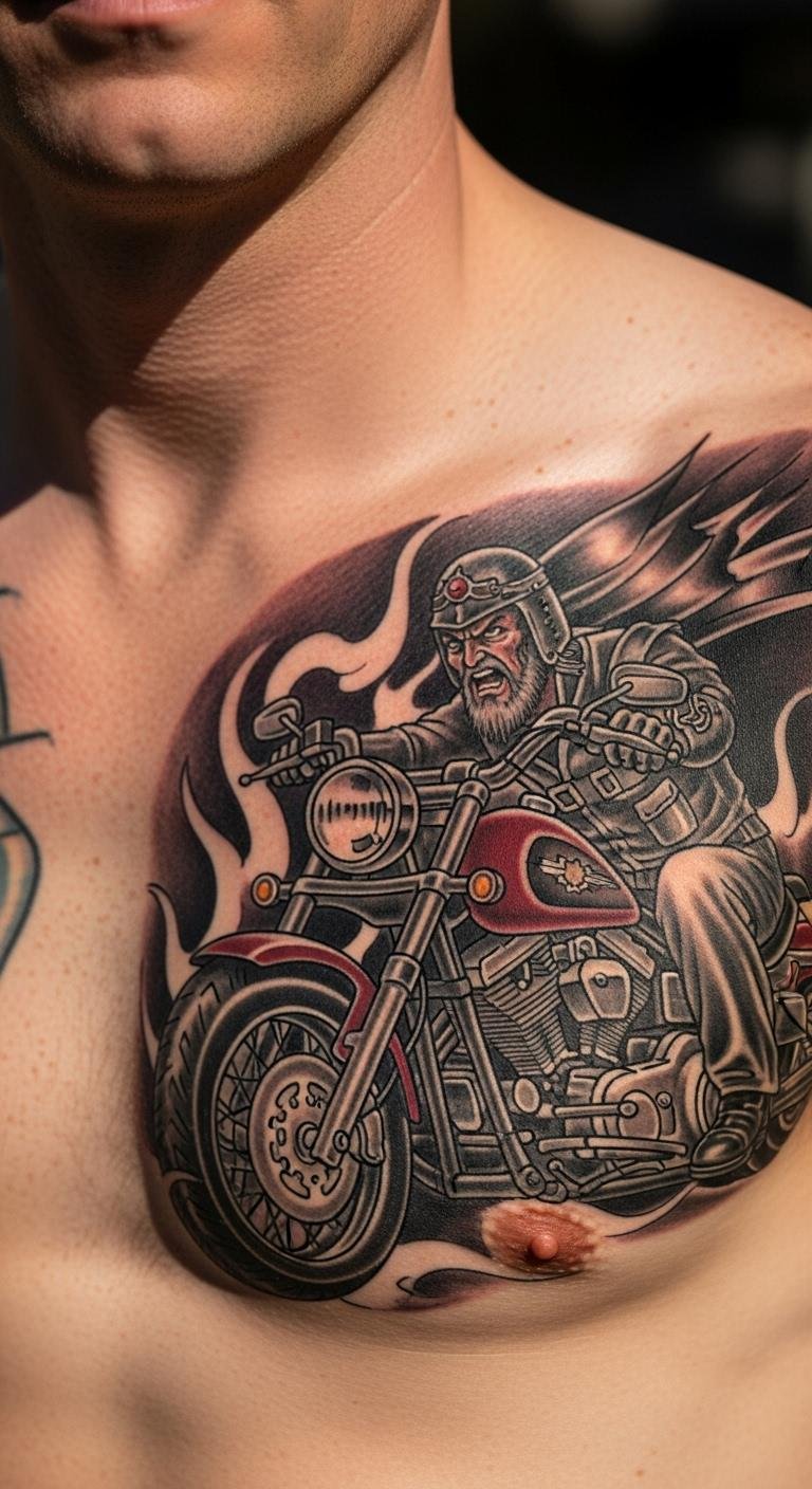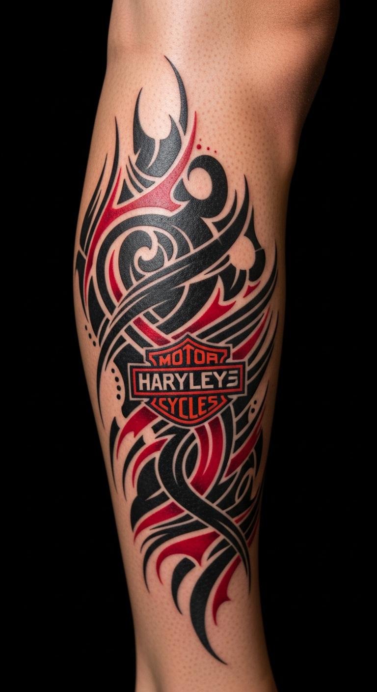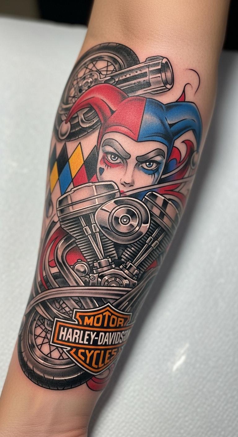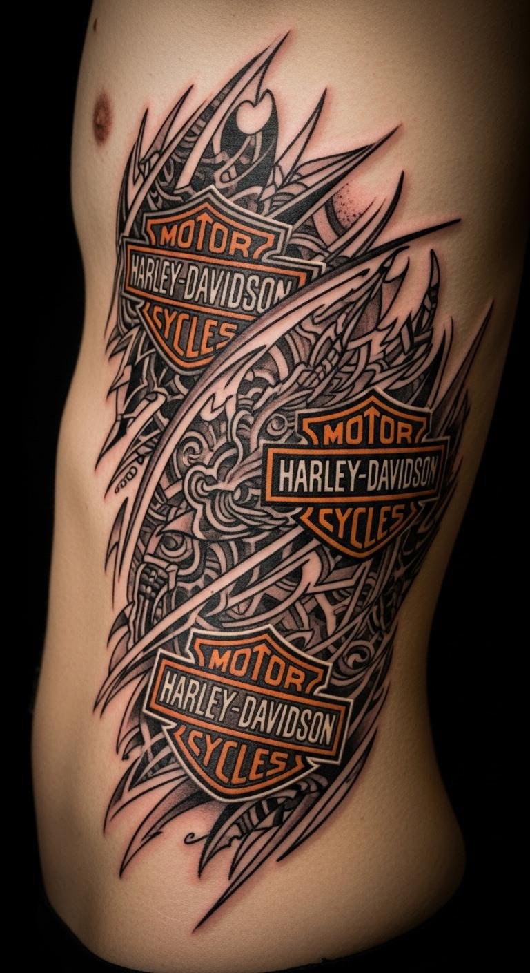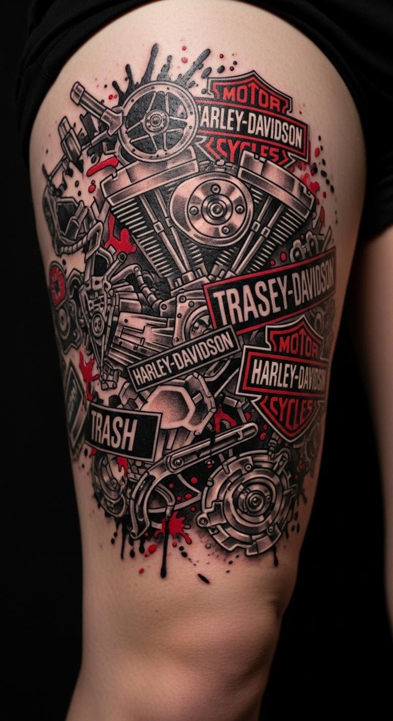 This style mixes chaos and cool. Think black and red splashes with Harley shapes. Grab inspiration from free apps. Draw rough versions at home with markers. Find an affordable artist online. They blend modern twists with your ideas. Use red accents for that edge. Place it on your back for a big impact. Aftercare is key—use basic lotion from the store. It symbolizes freedom on two wheels. Experiment with sketches before committing. You’ll stand out at rallies. Keep it fun and fierce.