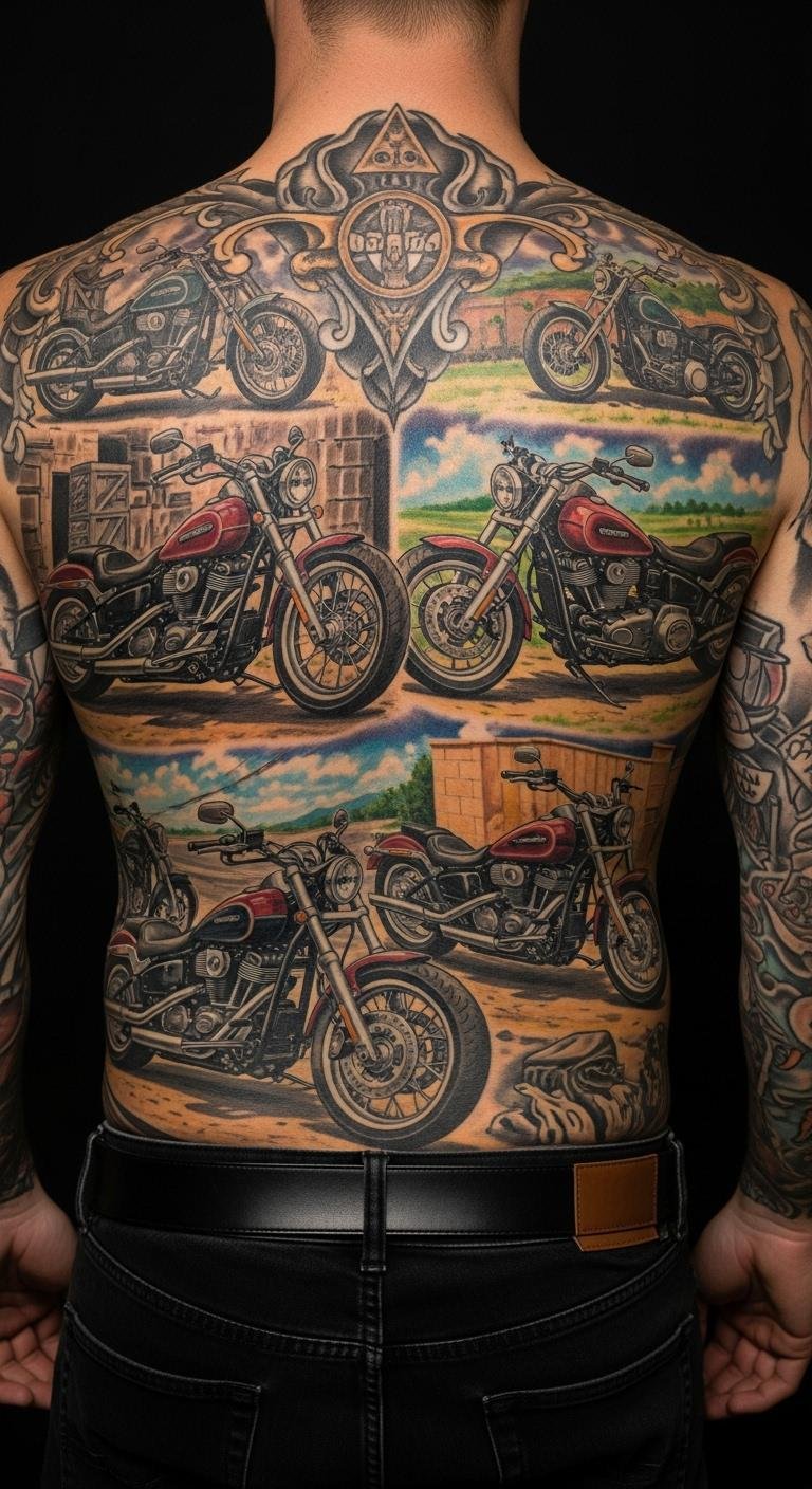 Go big with a sleeve of icons. Mix bikes and parts. Plan on paper first. Use free apps for layouts. Visit a nearby parlor. Break it into sessions to cut costs. Place elements strategically. Heal with basic care. Make it your story. Draw ideas nightly. Show off on rides.