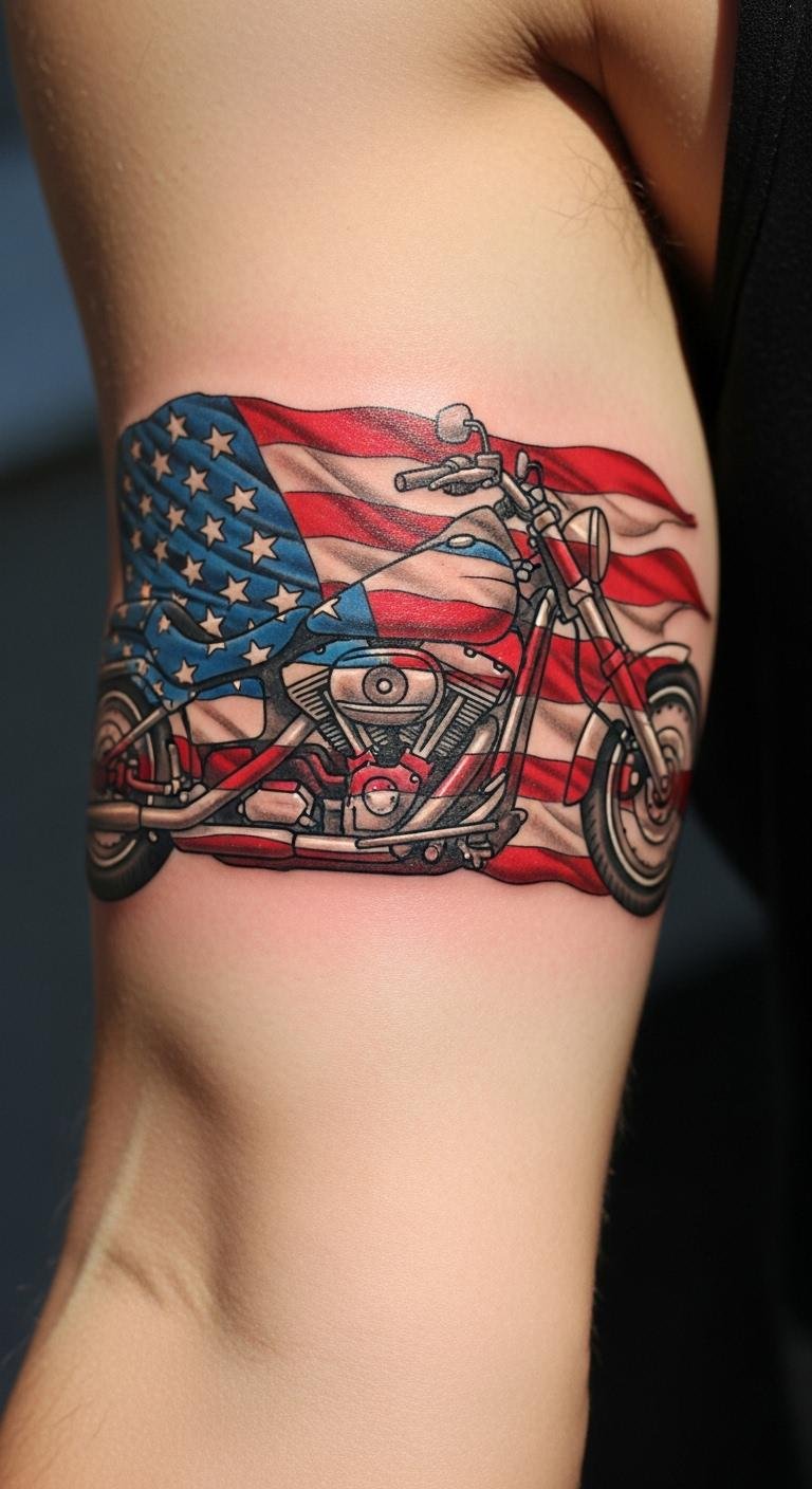 Flags add patriotism to your ink. Blend stars with bike shapes. Sketch at your table. Find free designs online. Choose a local tattooist. Use simple colors. Put it on your shoulder. Protect with sunscreen. This honors freedom. Test with stencils. Ride with flag pride.