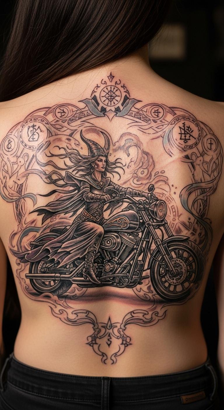 Mix magic with bikes for flair. Draw the figure simply. Use online resources for free. Book a budget session. Opt for dark shades. Place on your back. Maintain with lotions. Add fantasy touches. Practice drawing first. Unleash your inner rebel.