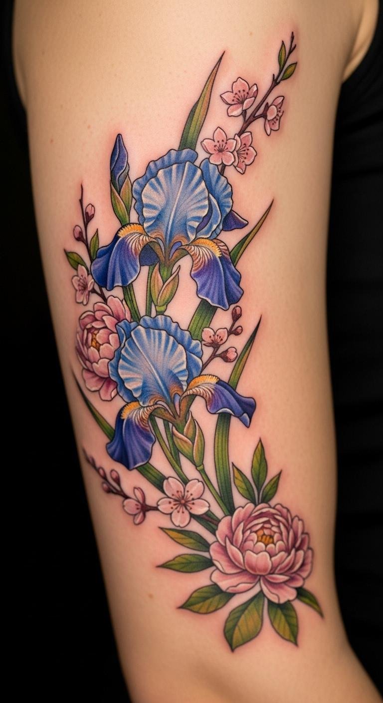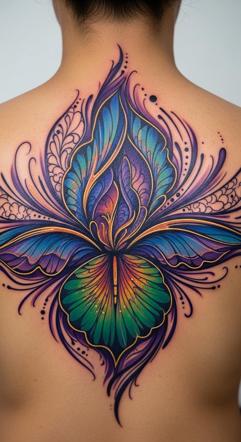 Go large with a back piece iris for statement. Big flowers take center stage. Look for $120 options. Outline it on paper. Cover the area fully. This design dominates. Break costs into parts. Multiple sessions help. This choice impresses. Big sketches prepare. Piece it together.