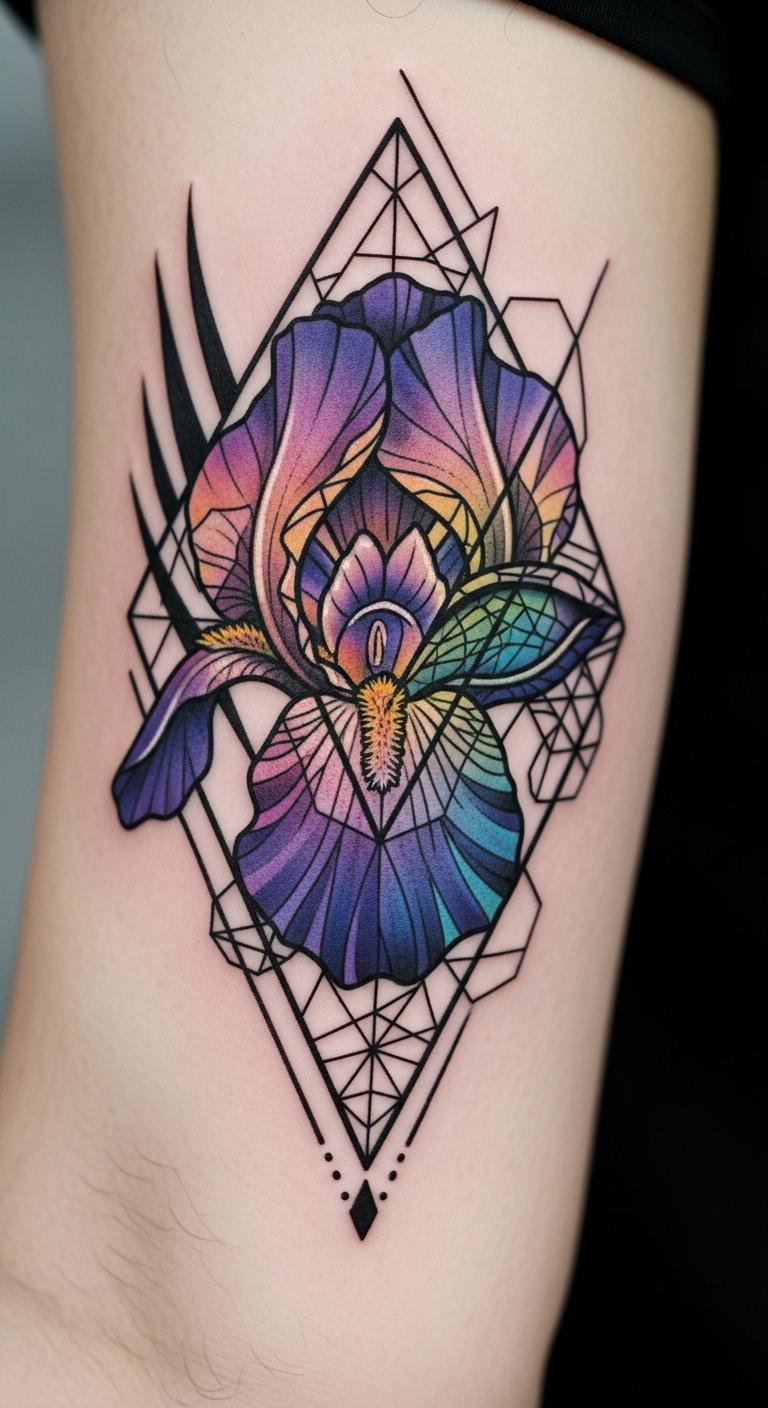 Fuse an iris with geometric shapes for modern edge. Triangles and circles add structure. Find artists for $70. Draw grids at home to plan. Blend flower with forms. This style updates classics. Cut costs with simple geometry. Book efficiently. This look trends now. Digital previews help. Get sharp and stylish.